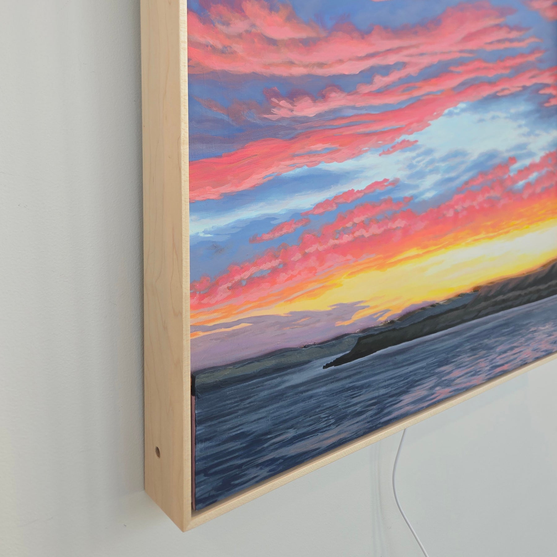 This is a very unique painting! The foreground is painted on a separate wood panel that is mounted slightly in front of the "background" sky panel. An LED light strip is mounted between the two wood panels; turn the lights on a subtle neon-style glow will illuminate the horizon. These are super cool! Using the included remote, you can choose to have a steady light or to have the light fade between different colors.