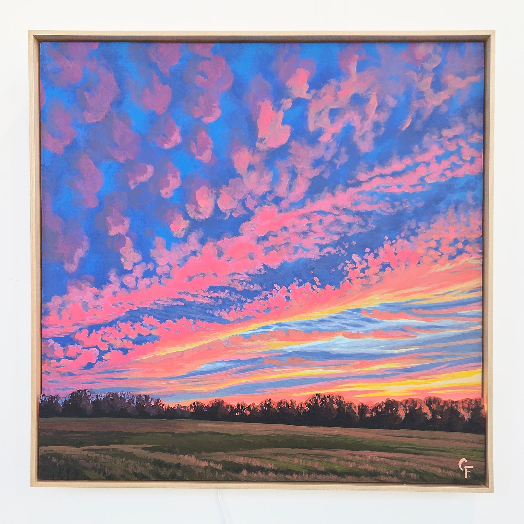 This painting shows the sun setting over a field in Enid, Oklahoma. This was the most spectacular sunset I have ever seen. I was driving home from work and the clouds hadn’t started to turn colors yet, but the shape and pattern of the clouds was perfect and I knew it was going to be something. I pulled over at one of my favorite photo-taking spots and waited. What an incredible treat.