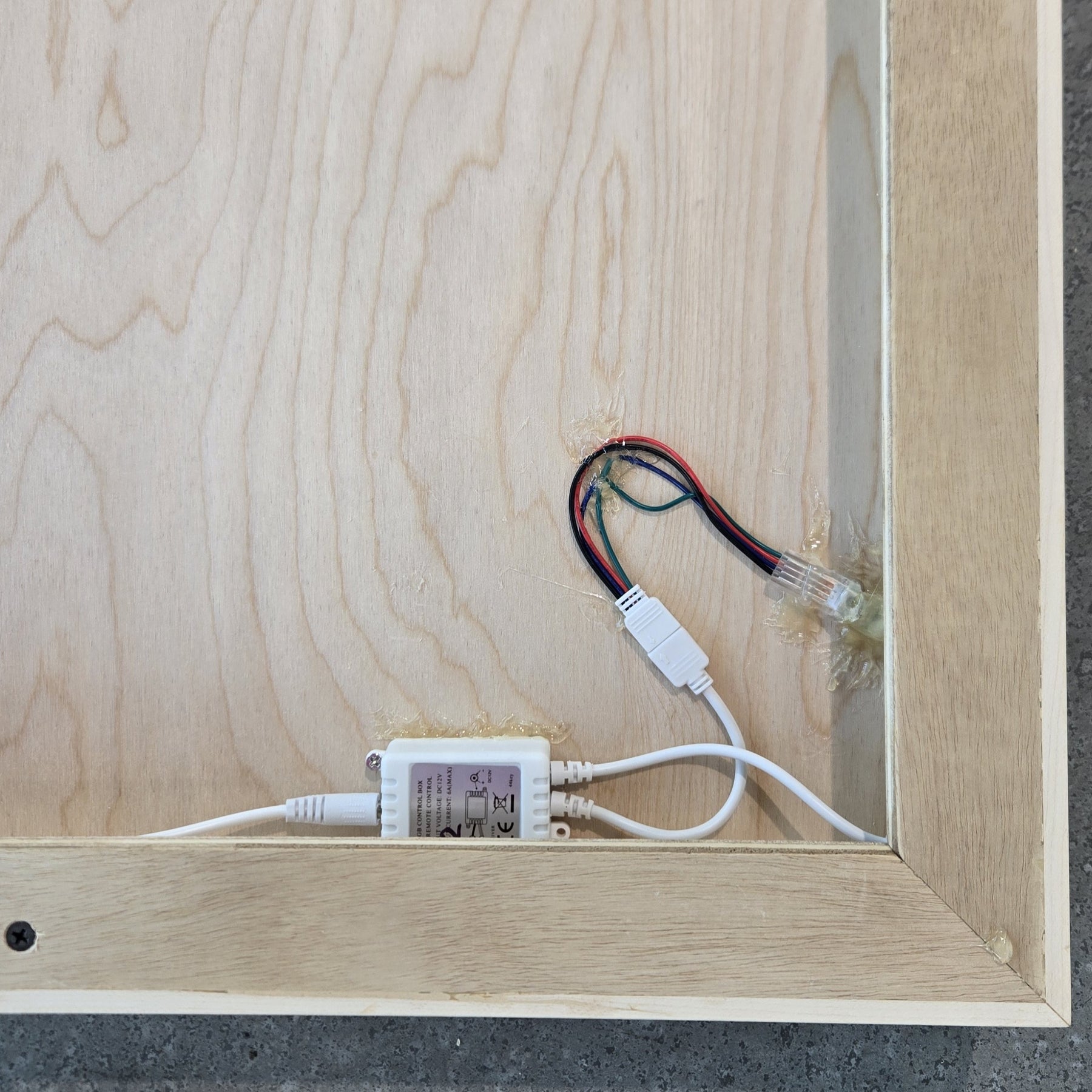 This is a very unique painting! The foreground is painted on a separate wood panel that is mounted slightly in front of the "background" sky panel. An LED light strip is mounted between the two wood panels; turn the lights on a subtle neon-style glow will illuminate the horizon. These are super cool! Using the included remote, you can choose to have a steady light or to have the light fade between different colors.