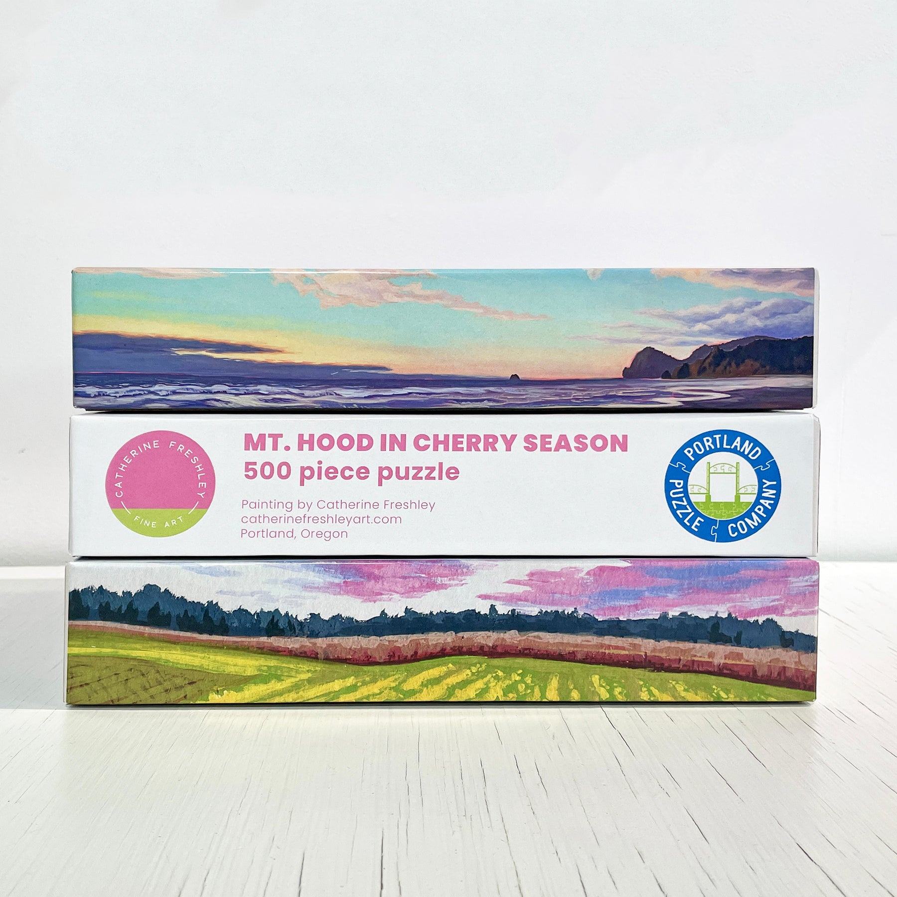 This set of three puzzles highlights Oregon’s diverse geographic beauty, stretching from Mt. Hood in the Cascade Range to the vineyards of Willamette Valley, to the rocky Pacific Ocean Coast.